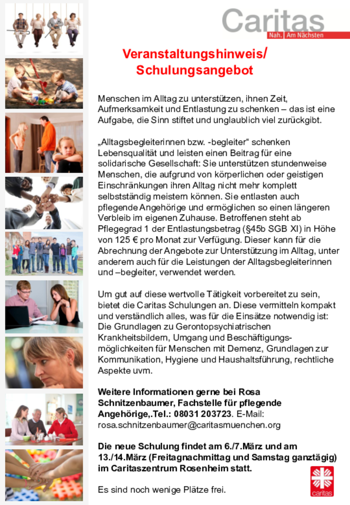 Weitere Informationen gerne bei Rosa Schnitzenbaumer, Fachstelle für pflegende Angehörige (Caritas) in Rosenheim. Telefon: 08031 203723. E-Mail: rosa.schnitzenbaumer@caritasmuenchen.org