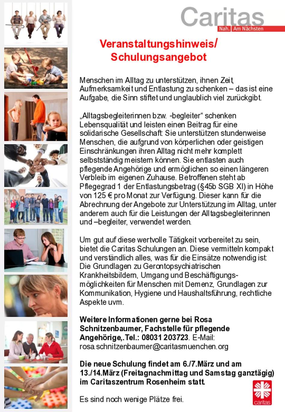 Die neue Schulung findet am 6./7.März und am 13./14.März (Freitagnachmittag und Samstag ganztägig) im Caritaszentrum Rosenheim statt.